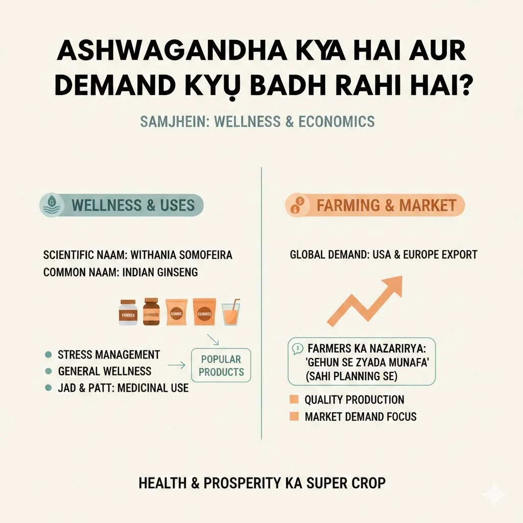 Market mein is waqt Ashwagandha powder, capsules, gummies aur herbal drinks kaafi chal rahe hain. USA aur Europe mein bhi export demand badh rahi hai. Farmers ka maanna hai ki ye gehun se zyada munafa dene wali crop ban sakti hai agar sahi planning ho.