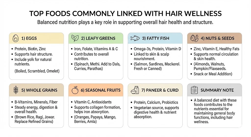 Tags: hair wellness foods, balanced diet for hair, Indian foods for nutrition, protein sources, biotin rich foods, omega-3 sources, lifestyle and hair health