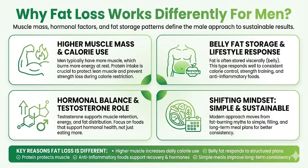Men usually carry more muscle compared to women. Muscle uses more energy even when the body is at rest. Because of this, men often respond better to fat loss plans that include enough protein. Protein helps protect lean muscle and prevents strength loss during calorie control.