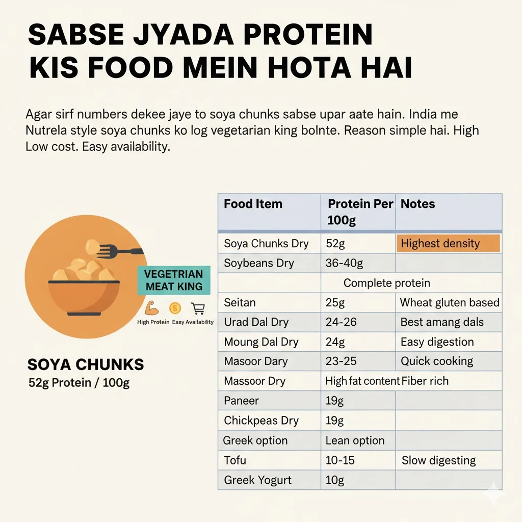 Agar sirf numbers dekhe jaye to soya chunks sabse upar aate hain. India me Nutrela style soya chunks ko log vegetarian meat king bolte hain. Reason simple hai. High protein. Low cost. Easy availability.